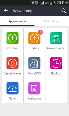 Der interessanteste Teil des 1Mobile Market ist der Manager. Die App-Manager hat drei Funktionen: Aktualisierung, Sicherung und Synchronisierung.