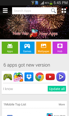 היישום 1mobile Market הוא השוק החלופה הטובה ביותר של חנות Google Play, והוא מתמחה למכשירים הפועלים במערכת אנדרואיד כגון מכשירי סמסונג (מובייל, טבליט, ונוט). הוא מכיל יותר מ- 800 000 יישום מסווג לפי סוג, או הפופולרי ביותר או שהורדו ביותר. ניתן להוריד יישומים כמו פייסבוק ומשחק ציפורים כועסת (Angry Birds) והרבה משחקים ויישומים בקלות.